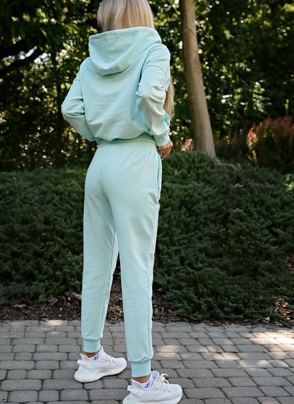 Efektowny, przyciągający uwagę dresowy komplet bluzy z dużym kapturem z długimi spodniami z kieszeniami.
