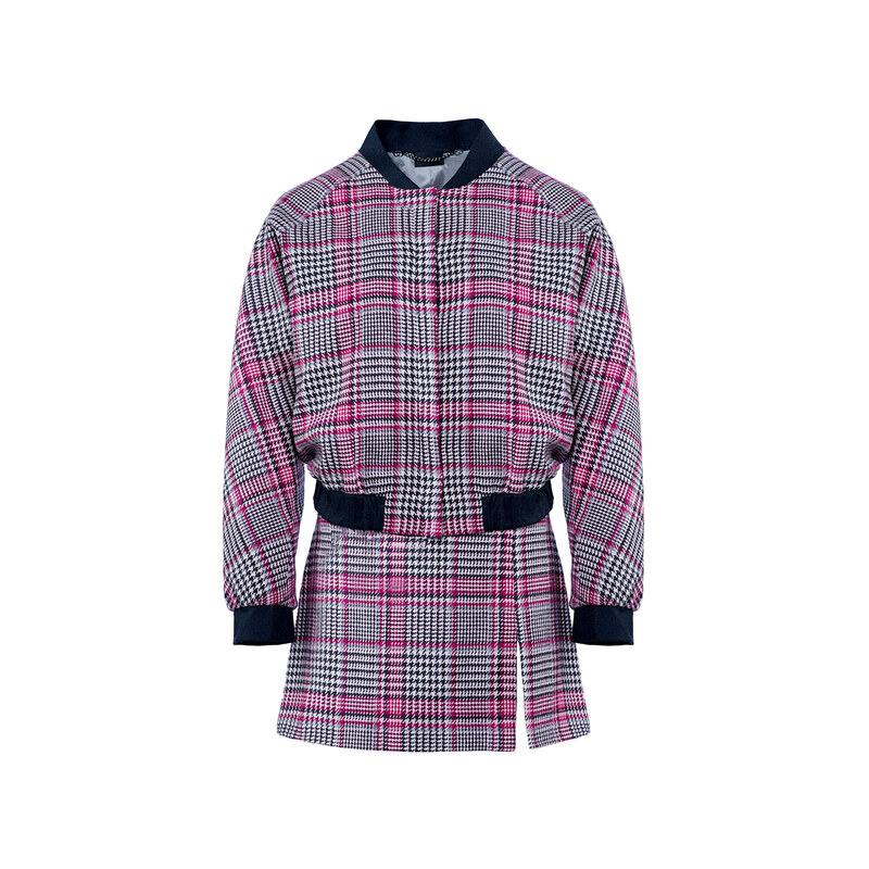 Elegancki komplet – bomberka w kolorową kratę, w zestawie z krótką spódnicą.