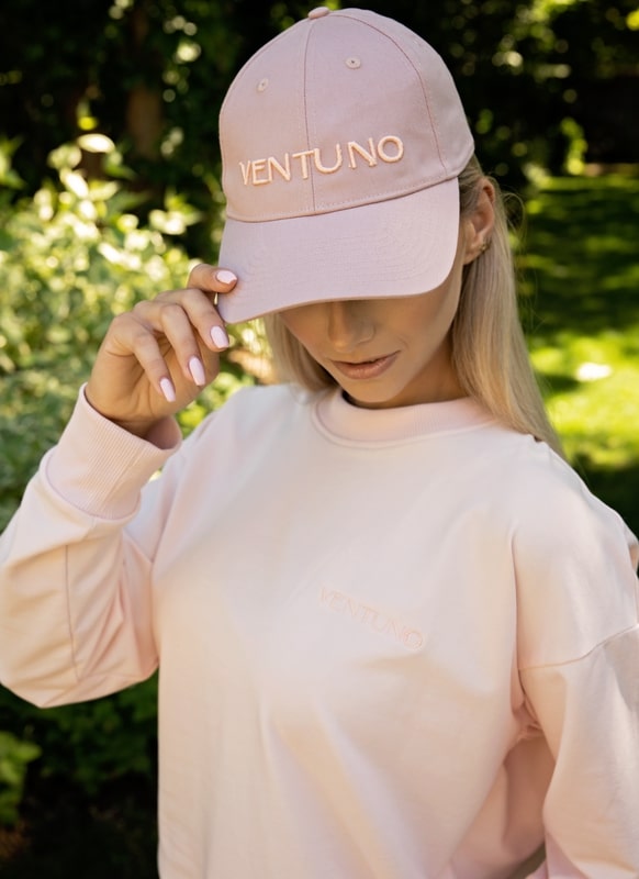 Piękny, pastelowy różowo-łososiowy kolor, okraszony wyszytym logotypem na spodenkach i bluzie.